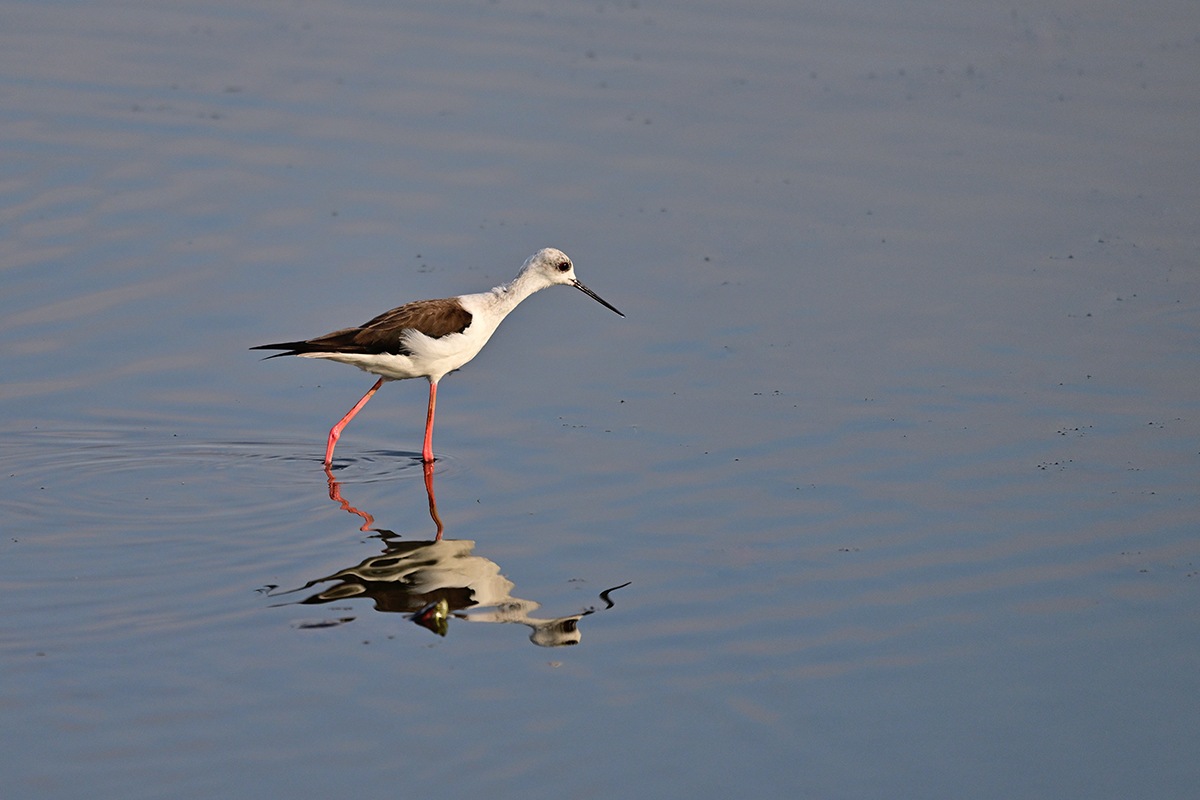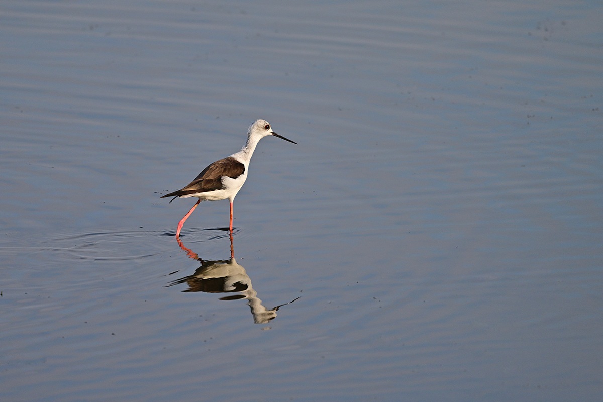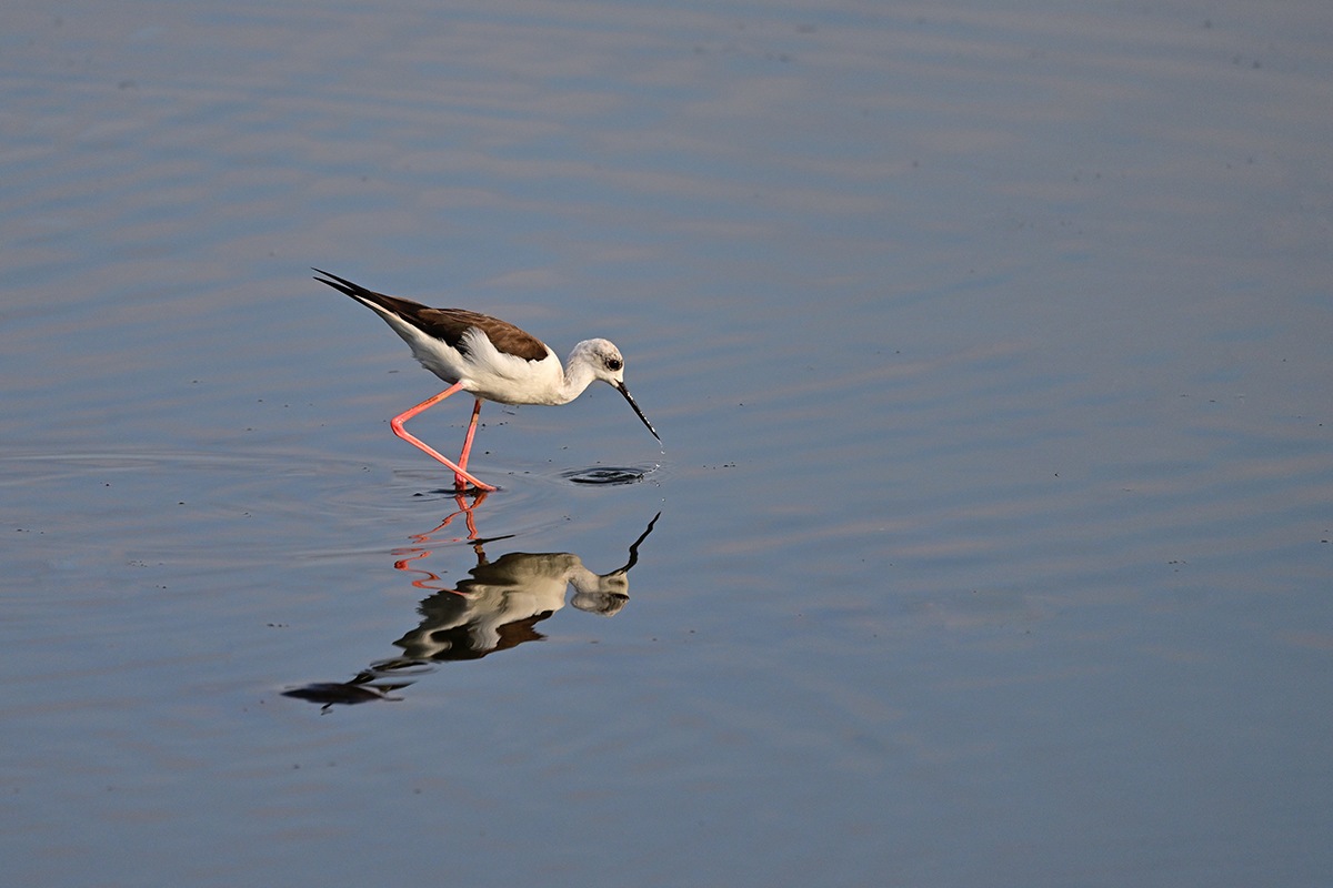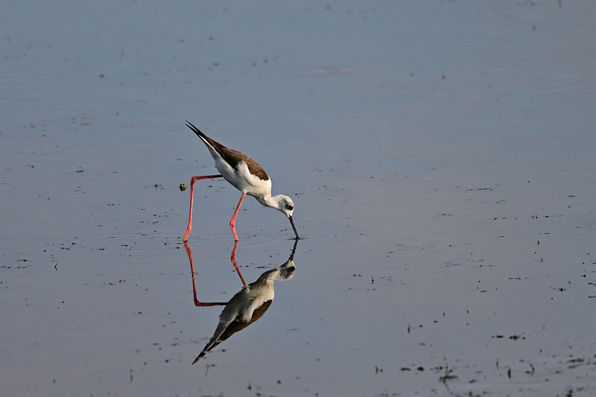 一羽のセイタカシギが鴨達と行動を共にしてる様です。丁度、早朝のお食事タイムであったのか彼方此方へと歩き回ってくれて良いのが撮れました。