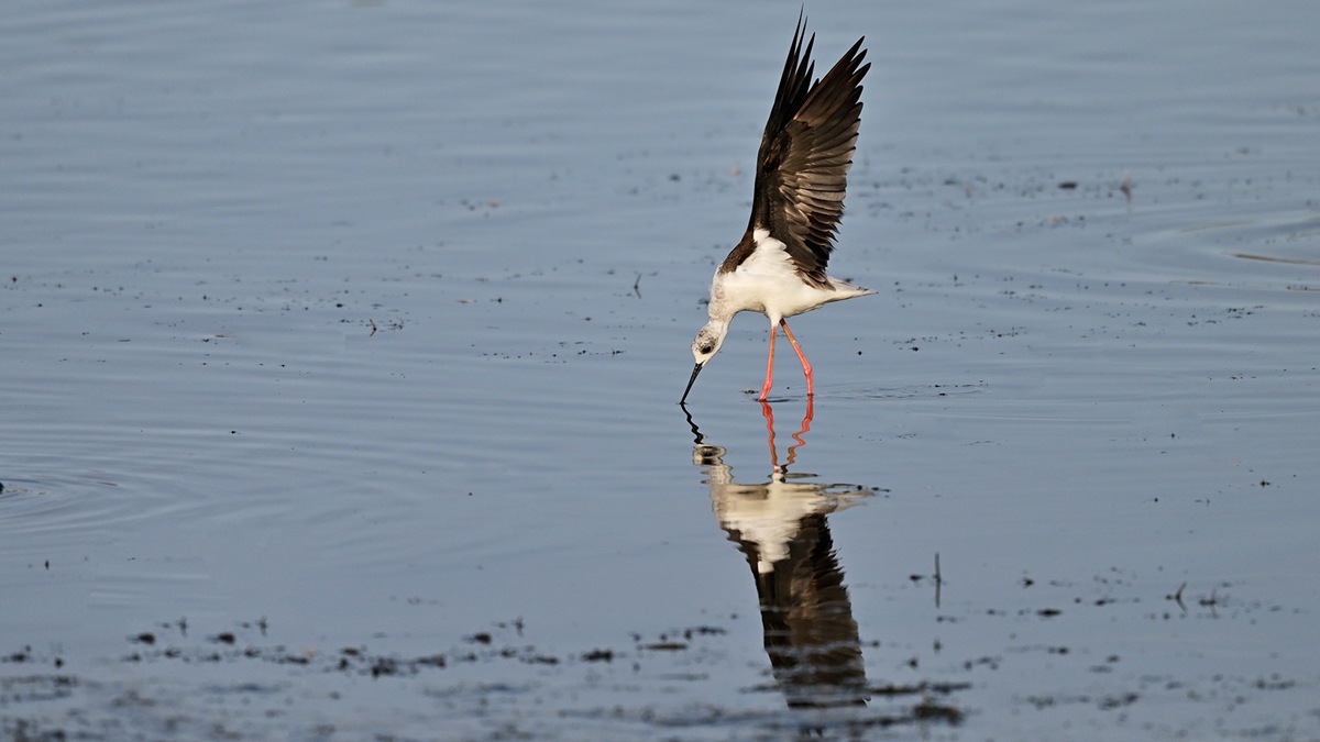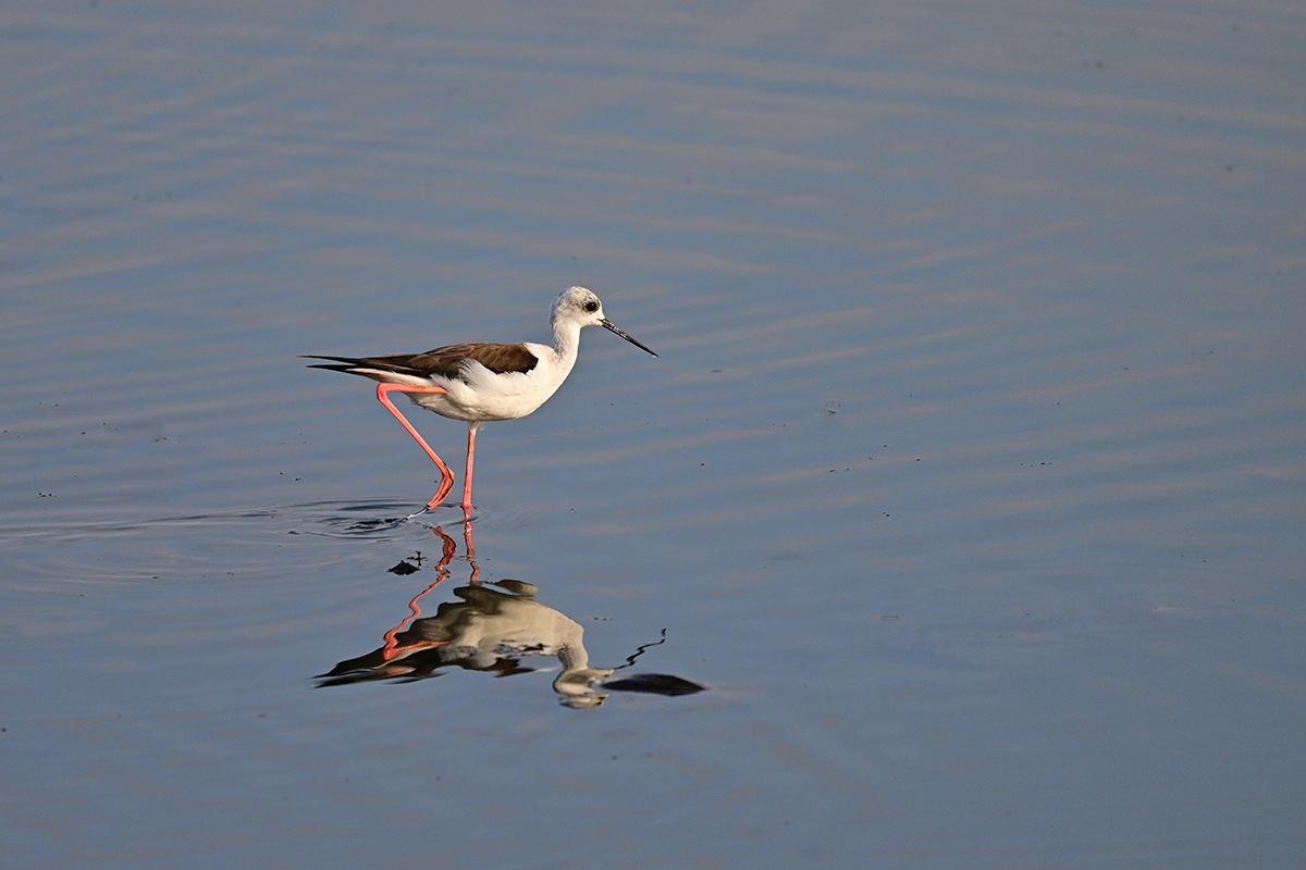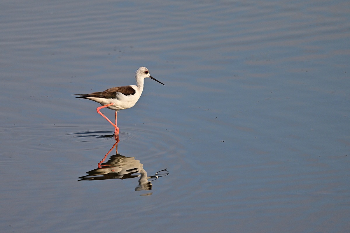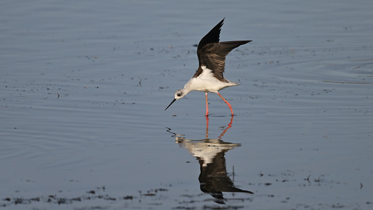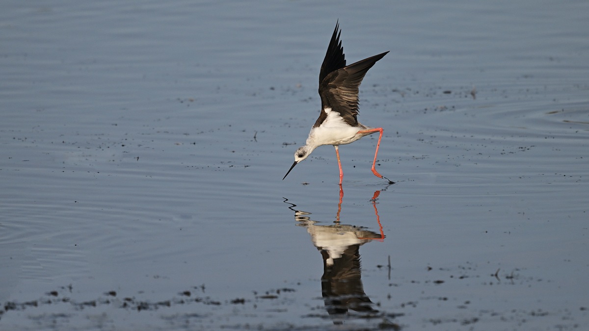一羽のセイタカシギが鴨達と行動を共にしてる様です。丁度、早朝のお食事タイムであったのか彼方此方へと歩き回ってくれて良いのが撮れました。