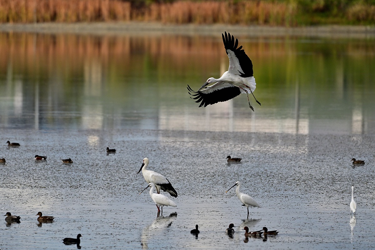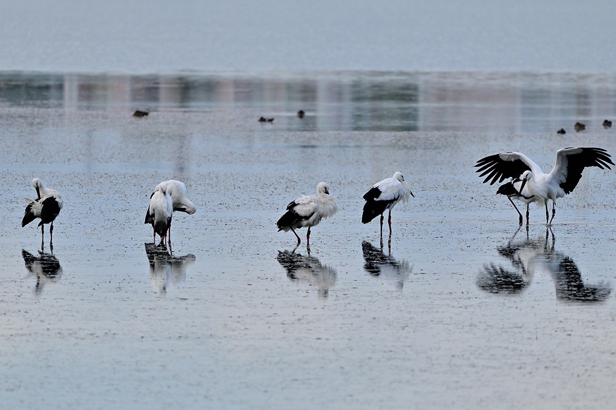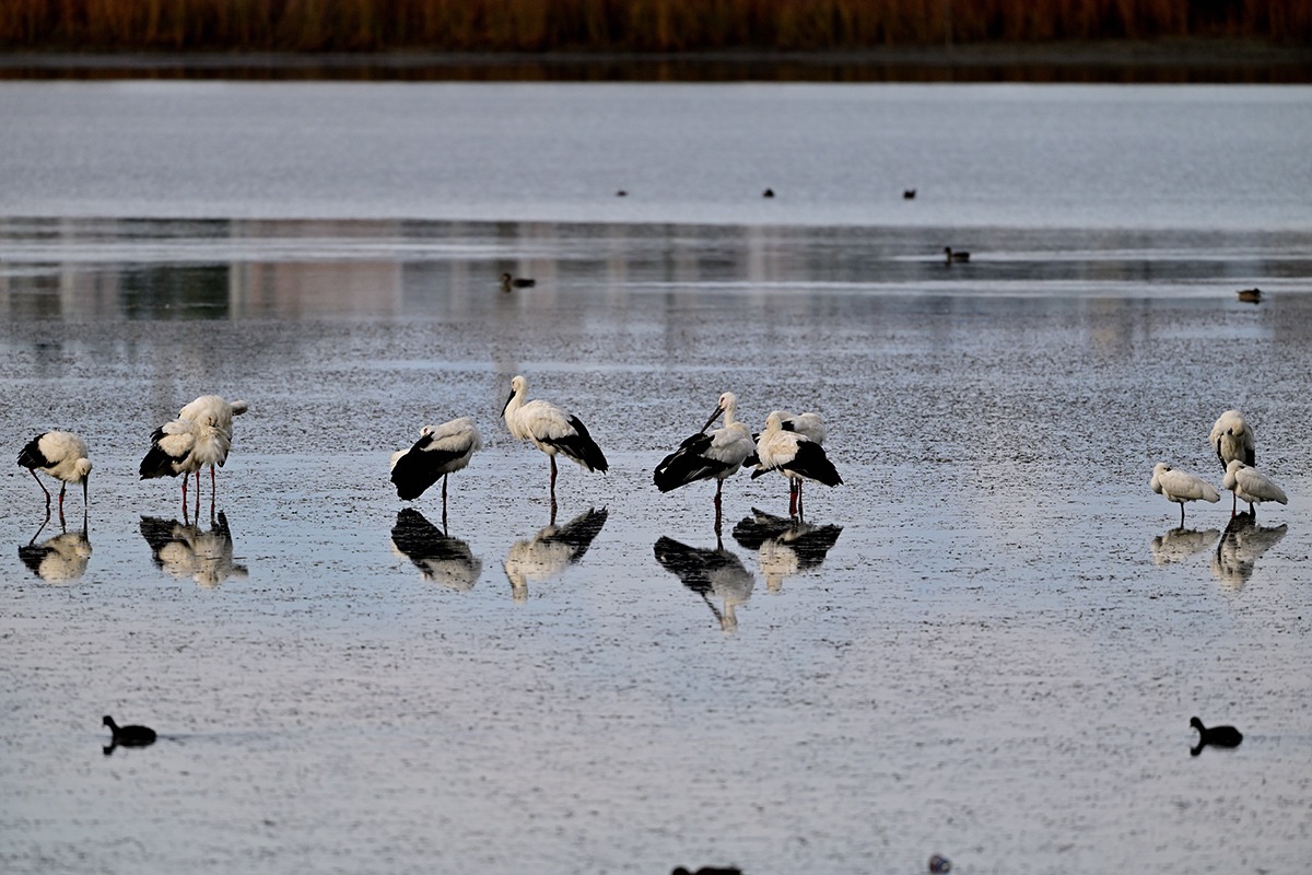 当方が現地に到着した時は、コウノトリ達、池の中央でお休み中で雲で朝陽がさえぎられフラットで絵にならない状態でしたが、その後雲が抜けて程良い光線状態になってくれたので上手い具合に撮れました。