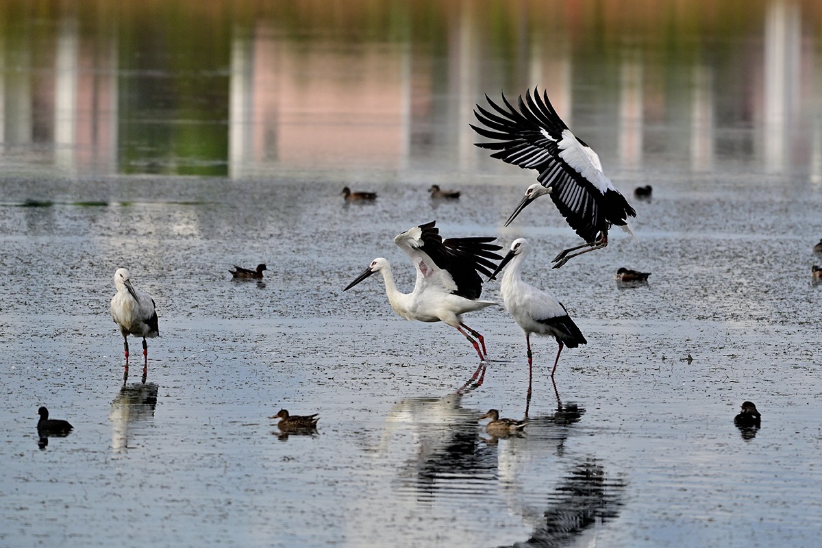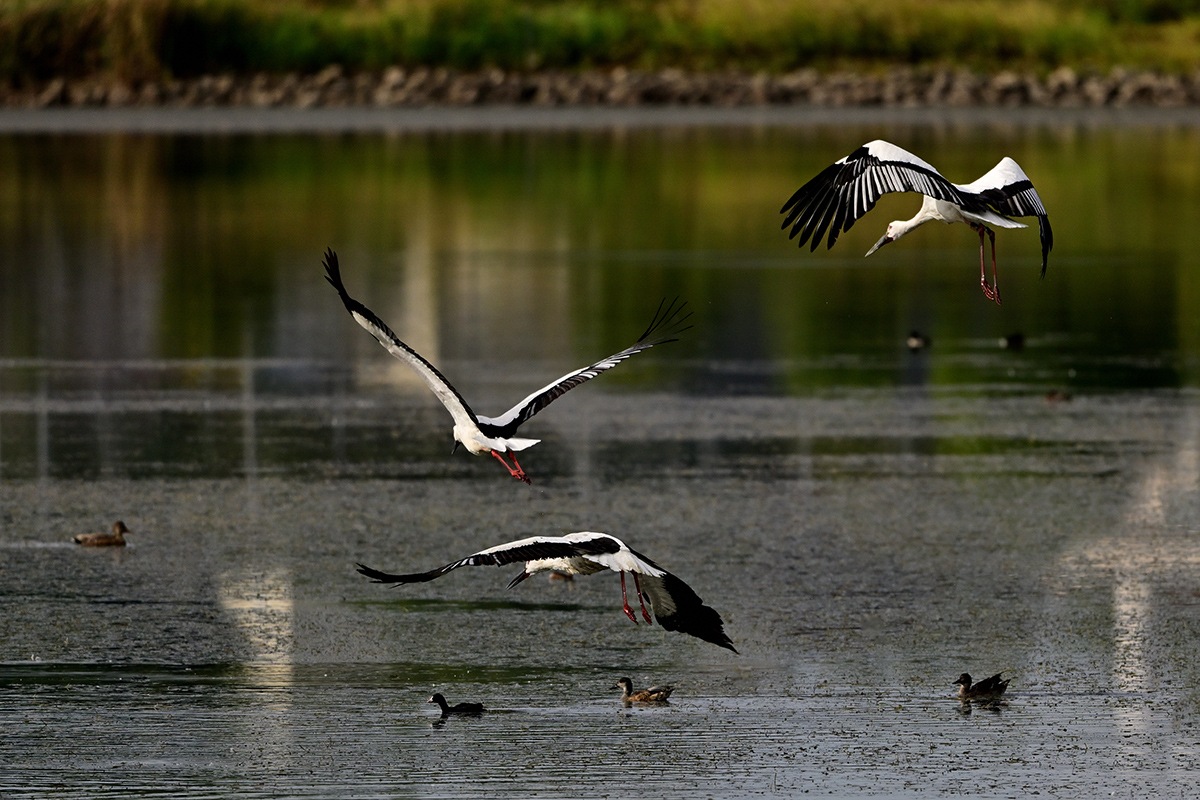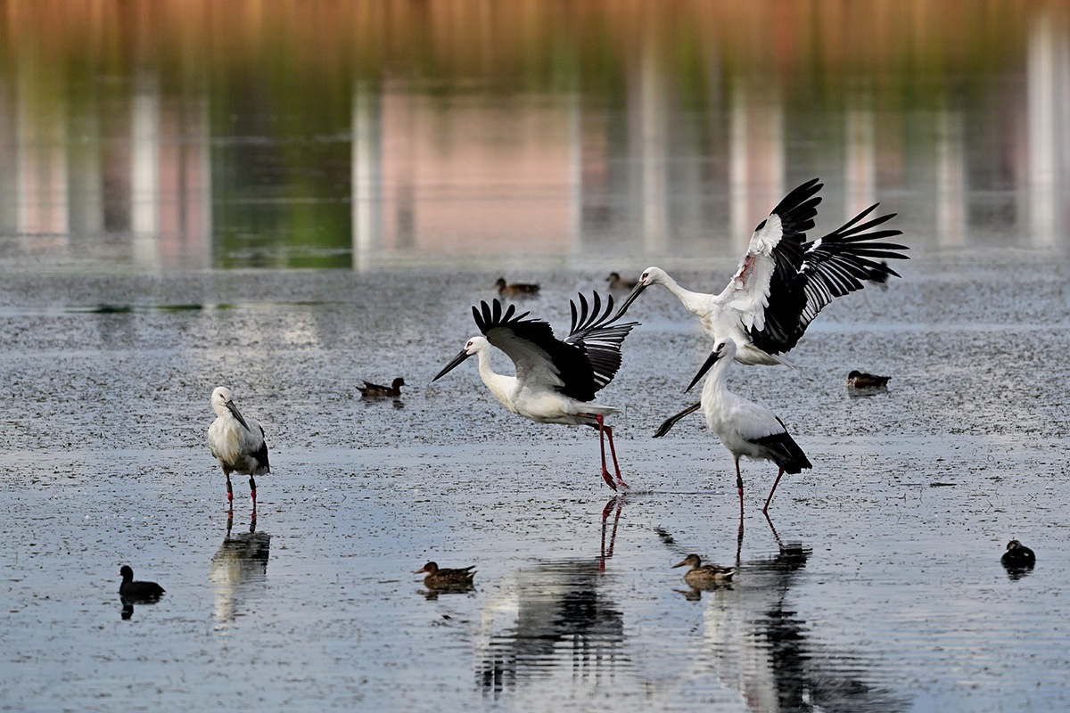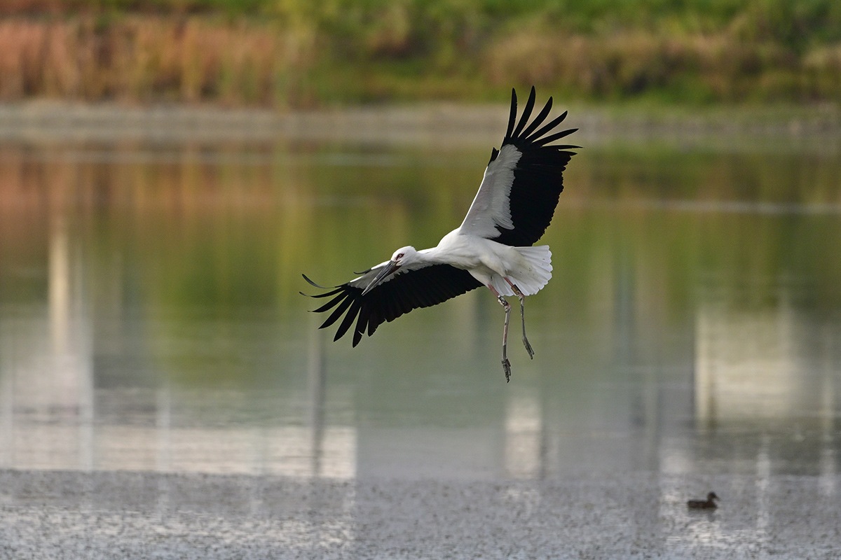 当方が現地に到着した時は、コウノトリ達、池の中央でお休み中で雲で朝陽がさえぎられフラットで絵にならない状態でしたが、その後雲が抜けて程良い光線状態になってくれたので上手い具合に撮れました。