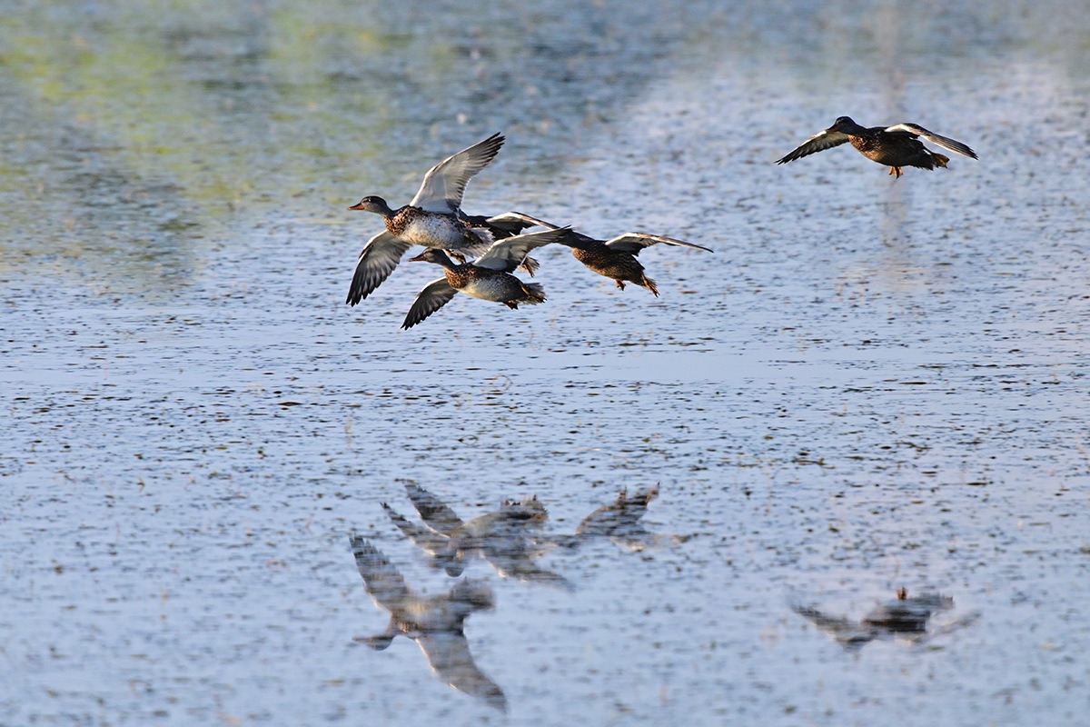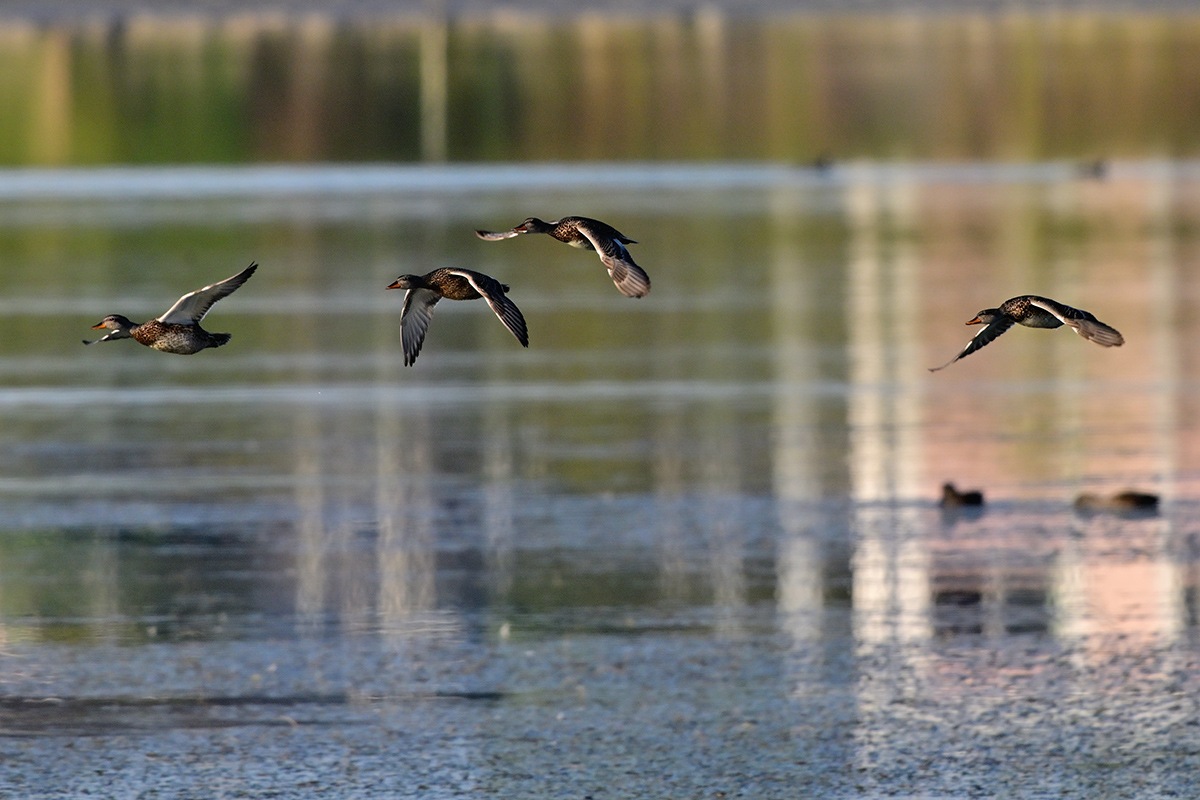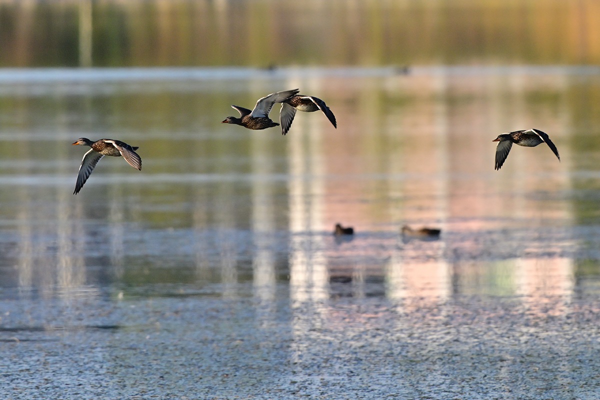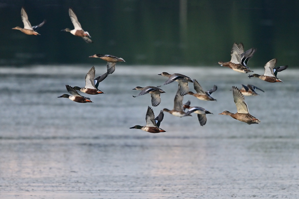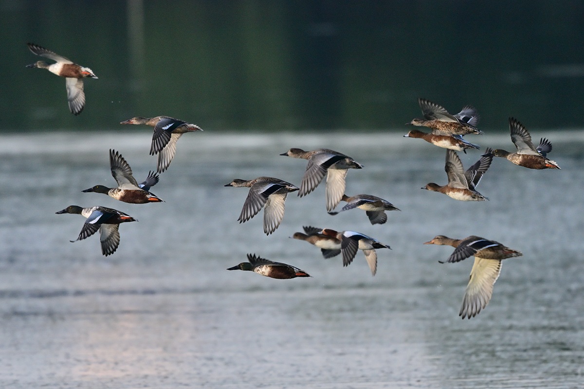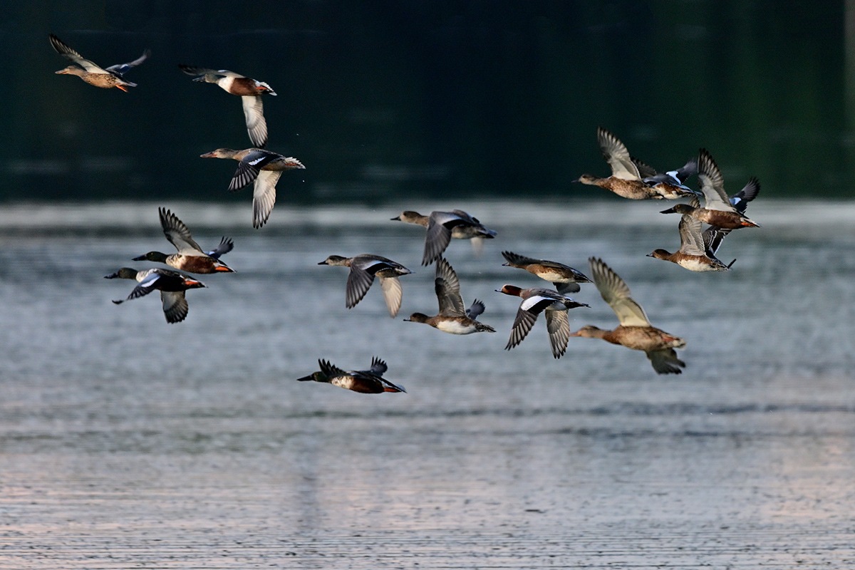 大池の鴨達、沢山居付いてます。理由は良く解らないのですが時折、別に猛禽類が出て来た様な異常があるわけでもなく揃って飛び立ちますね。池をぐるぐると旋回して着水してます。