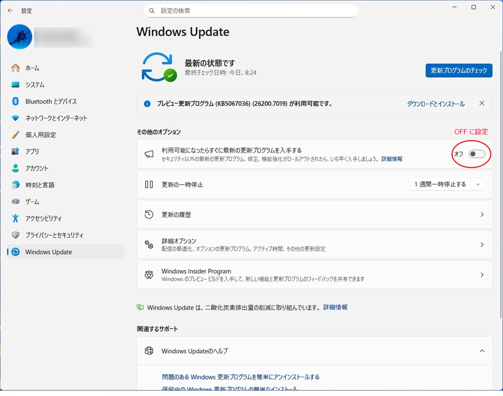 ”利用可能になったらすぐに最新の更新プログラムを入手する” を “OFF” に設定してます。