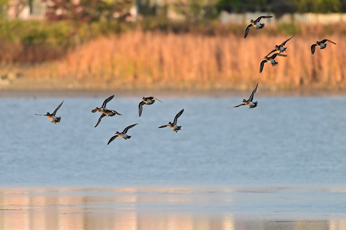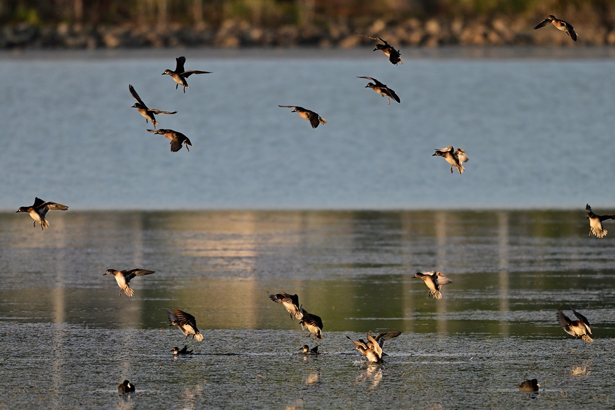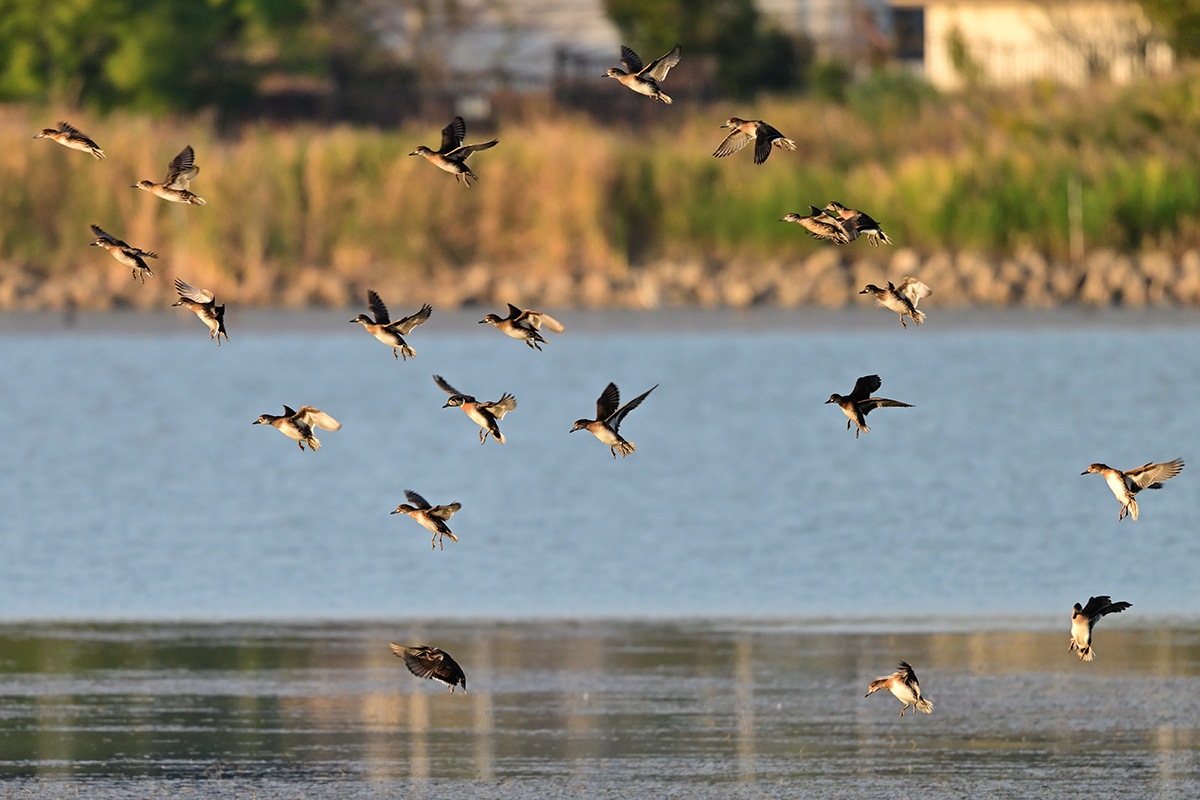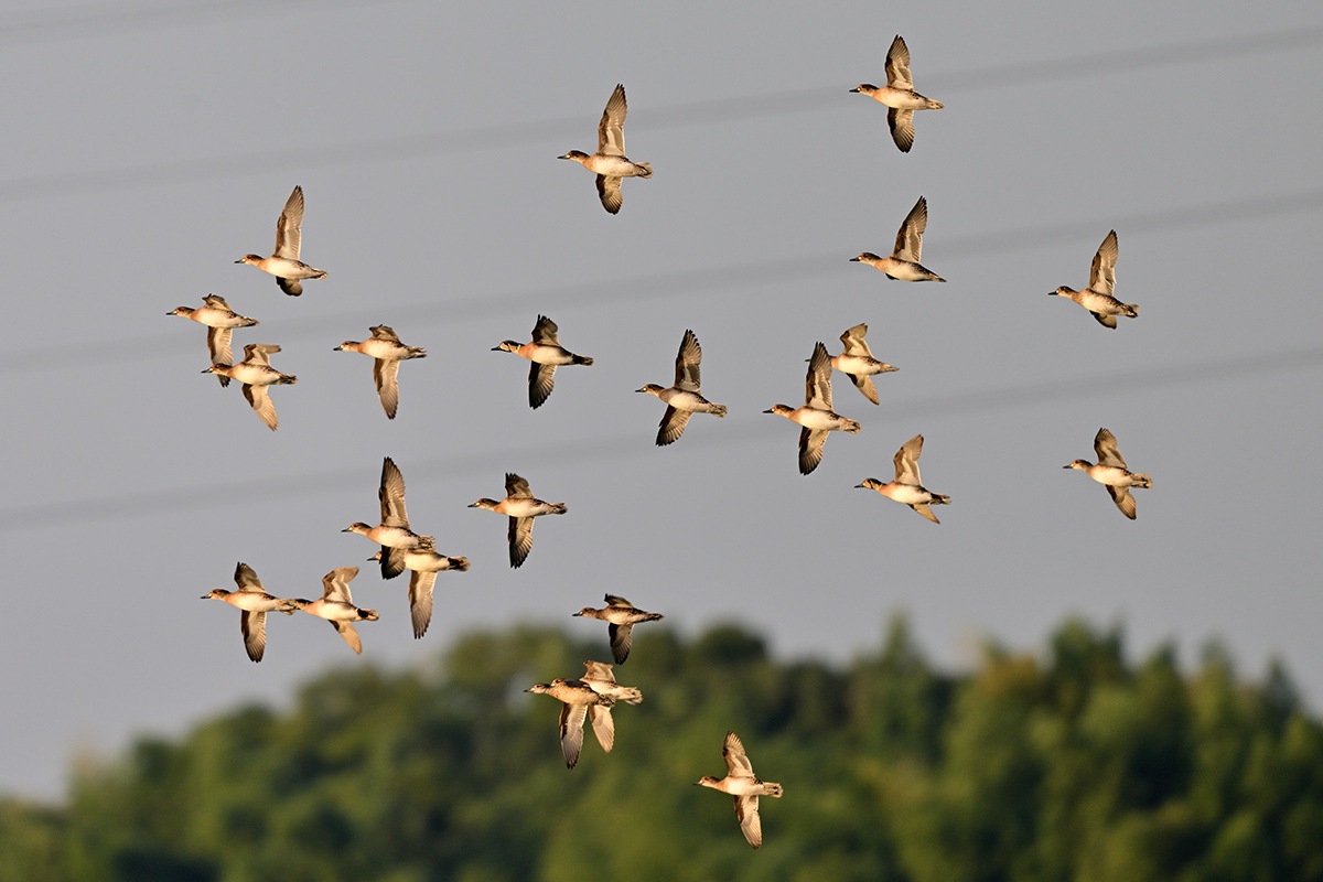 大池でヘラサギ撮影してると鴨の大きな群れが飛翔して来ました。