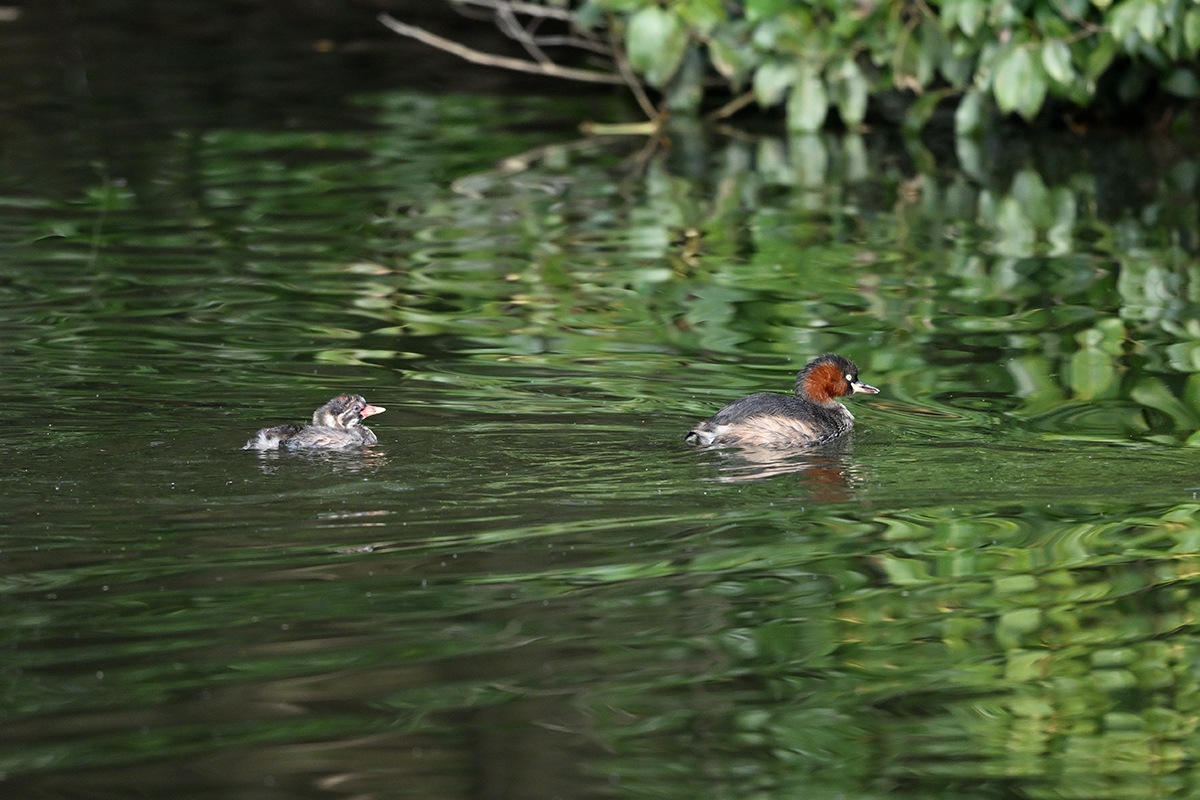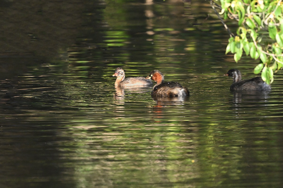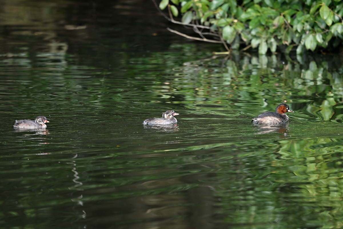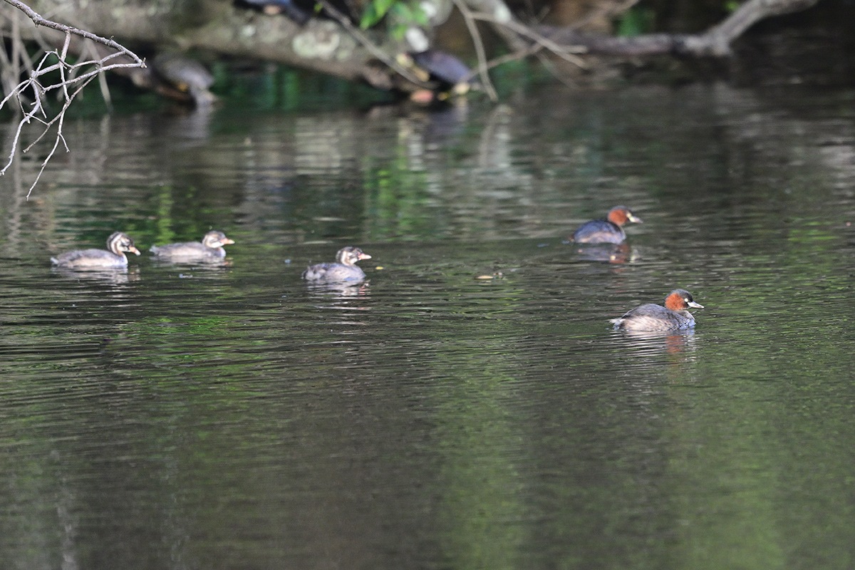 既に大きくなった3羽の幼鳥と親鳥の5羽でのんびり暮らしてるカイツブリ家族。他のカイツブリは見当たらなくてこの小池にはこの家族だけの様です。