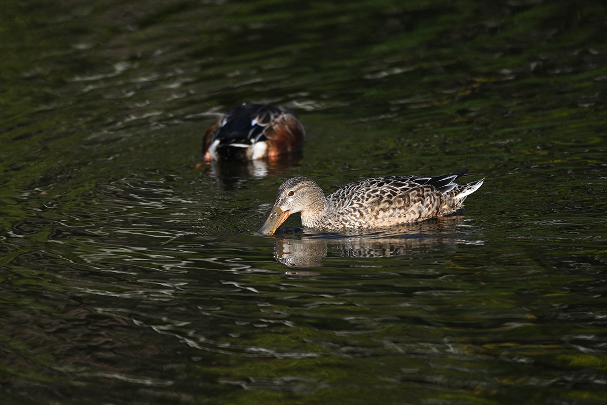 オシドリの小池に毎年マガモは入って来るのですが今年はハシビロガモのペアーも同居してます。