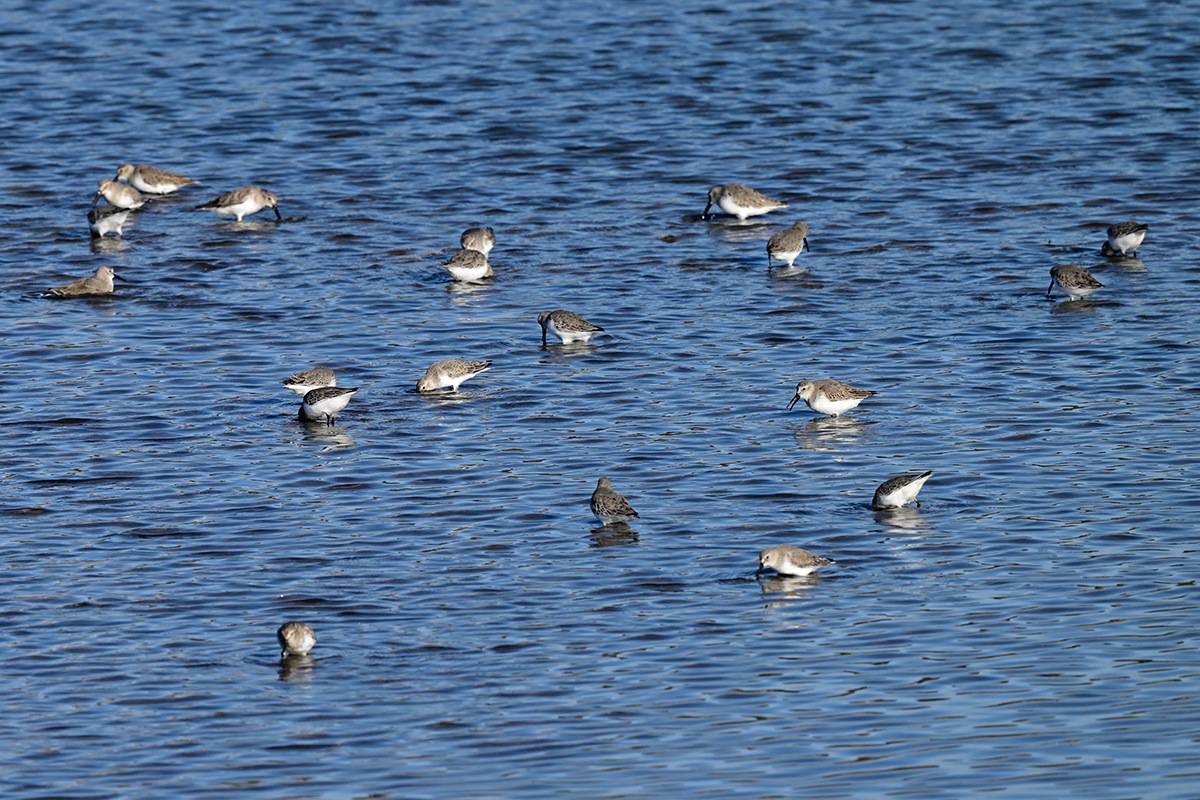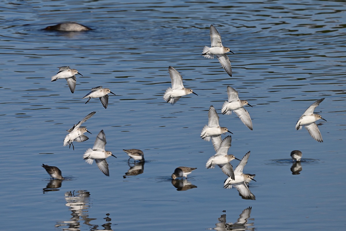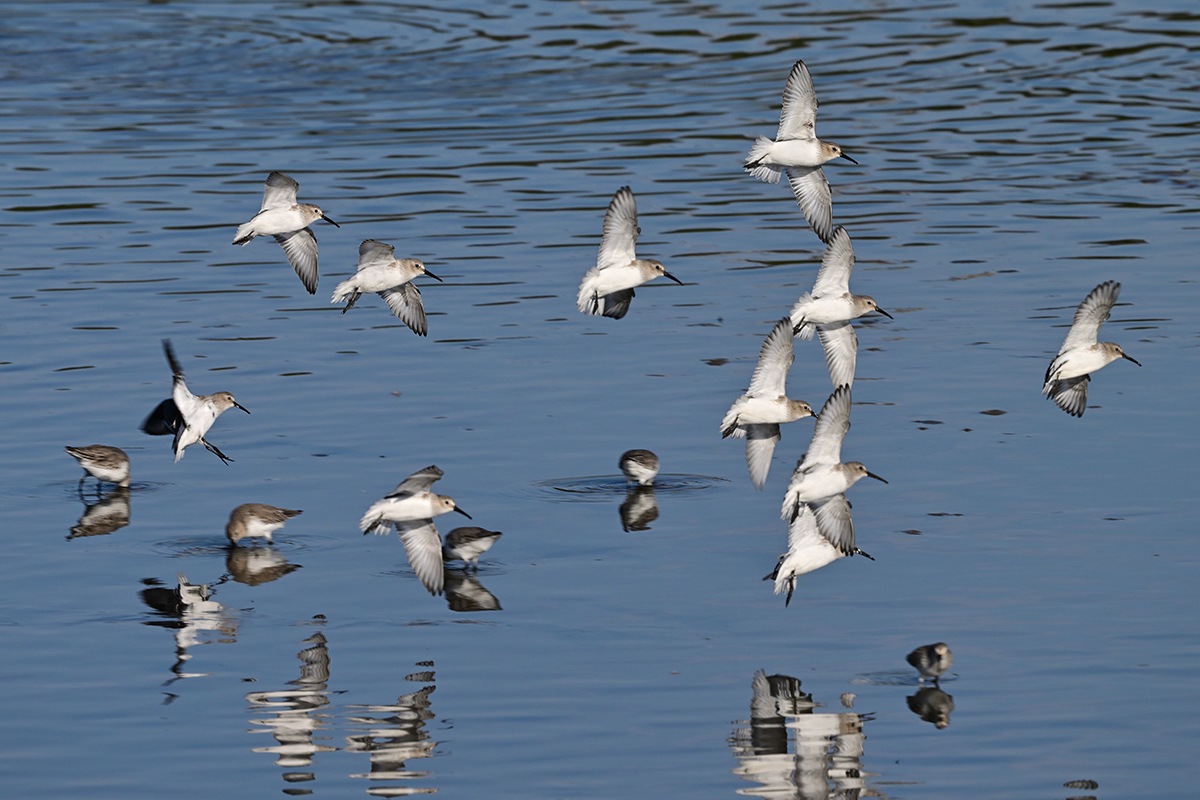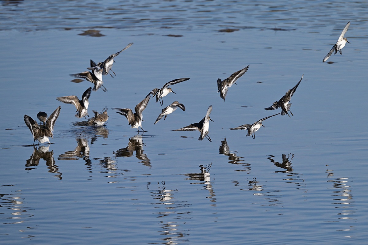 美しい渚に群れるハマシギ達、大きな群れで飛翔すると、まるで別の生物の様相です。