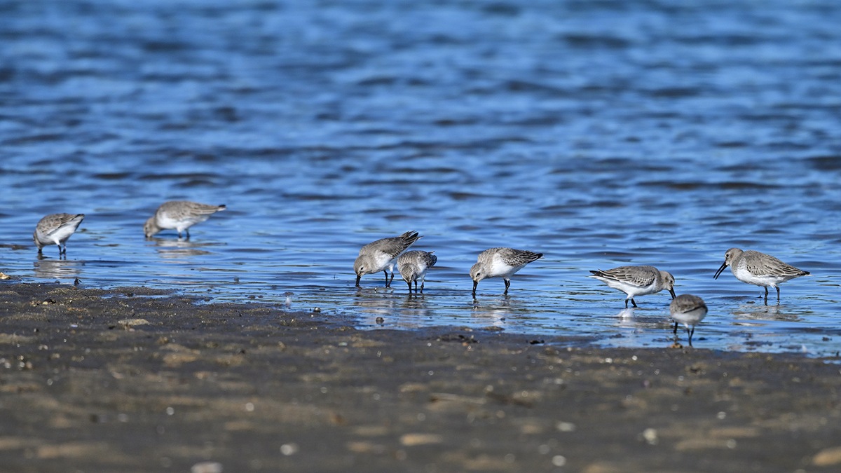 早朝の渚で餌を啄むハマシギを含めて群れでの飛翔を動画に纏めてみました。
