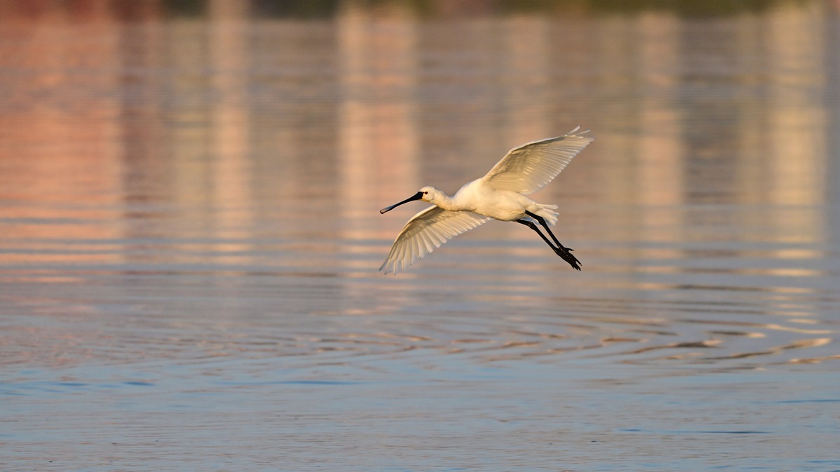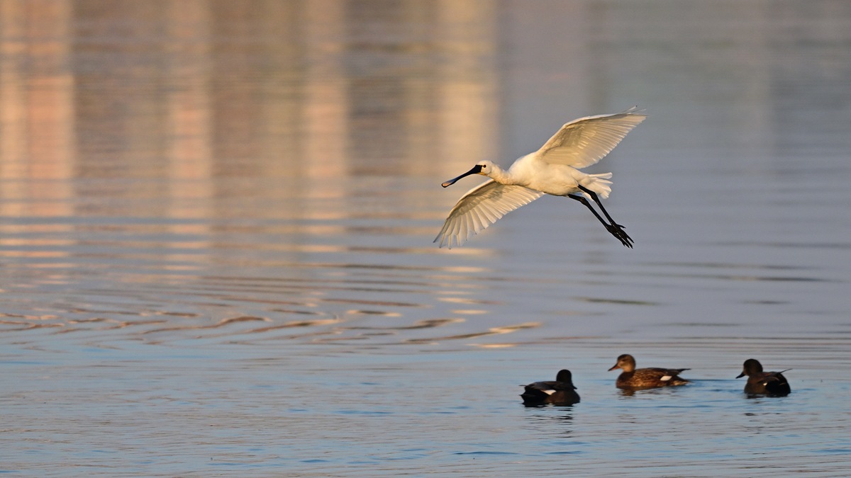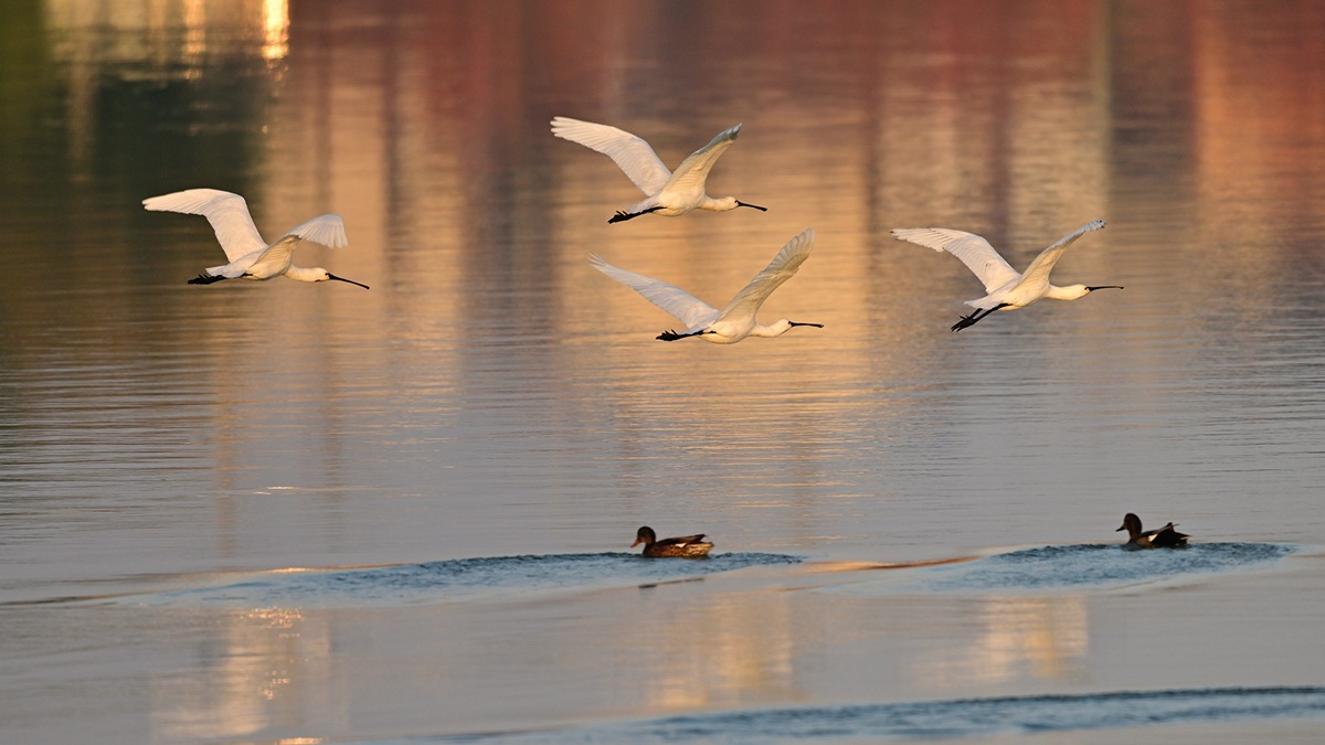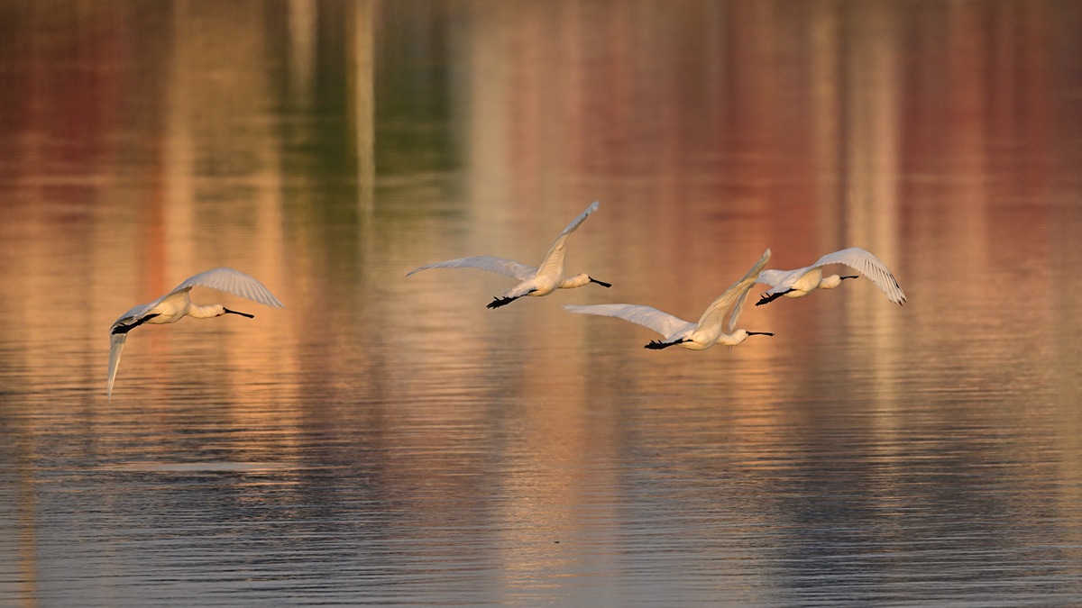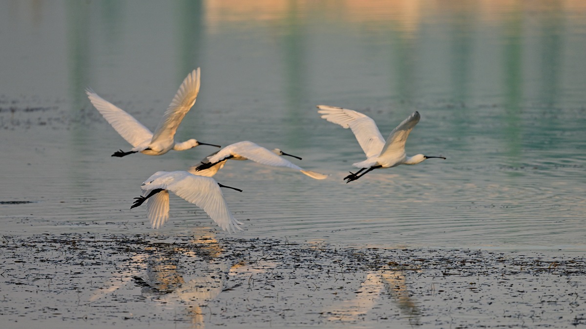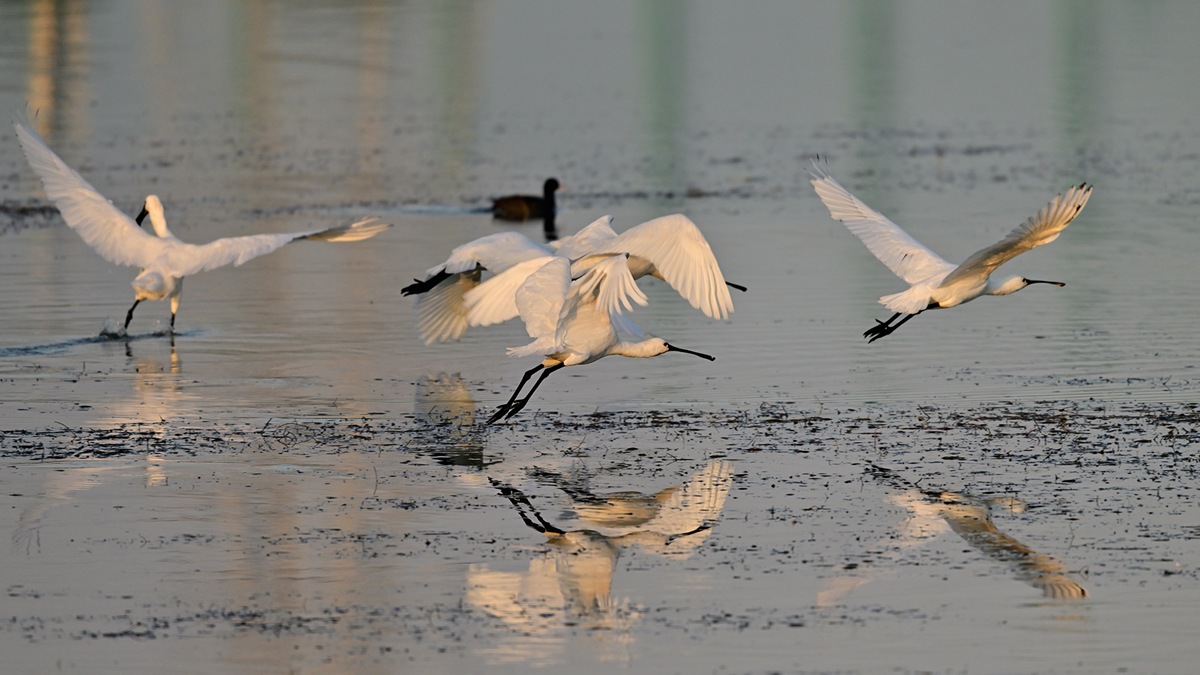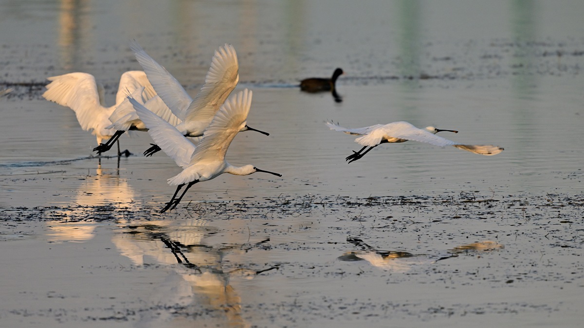 写真9 朝日に輝くヘラサギ達動画 (From YouTube)