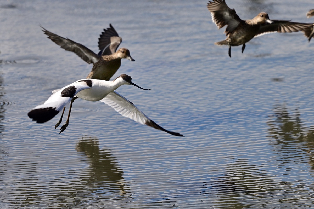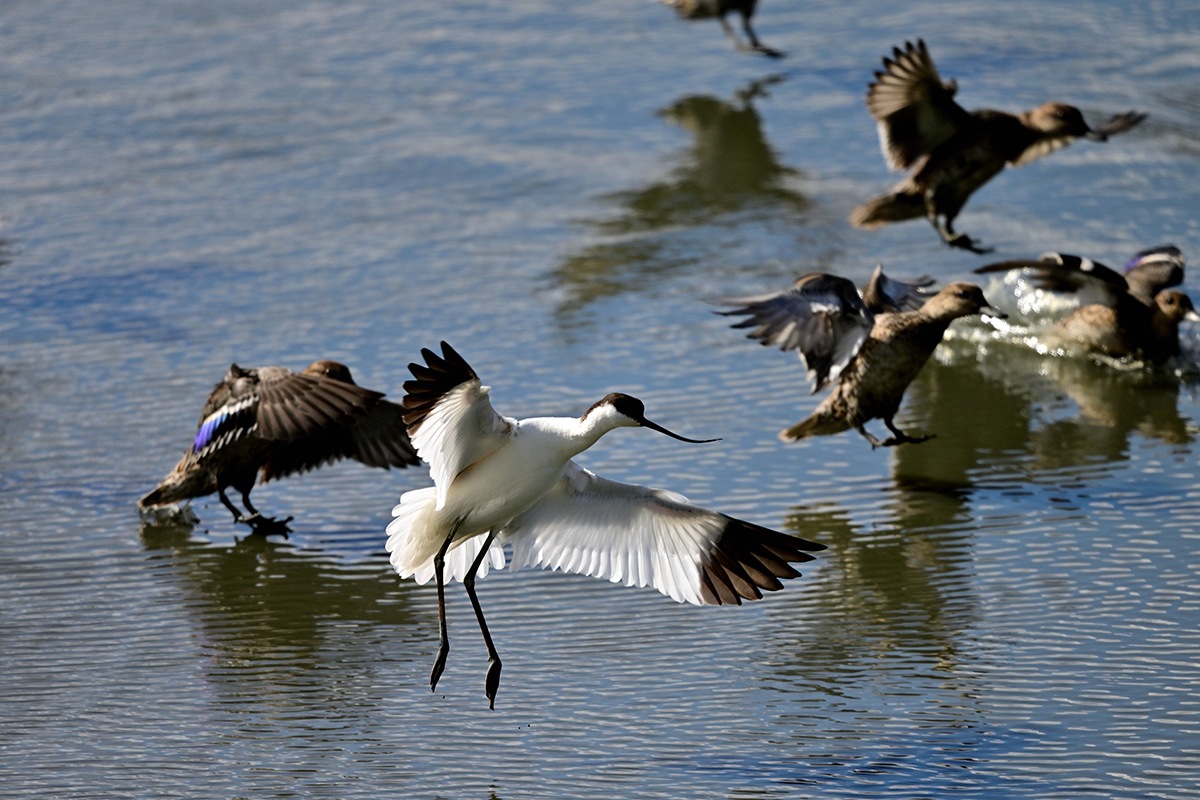 写真7 ソリハシセイタカシギ 何かに驚いてコガモと共に飛び出し![]()