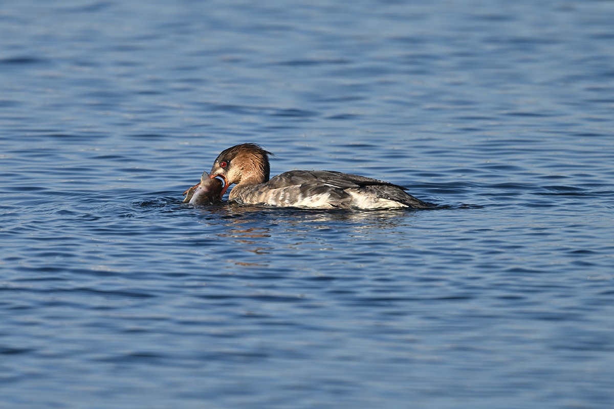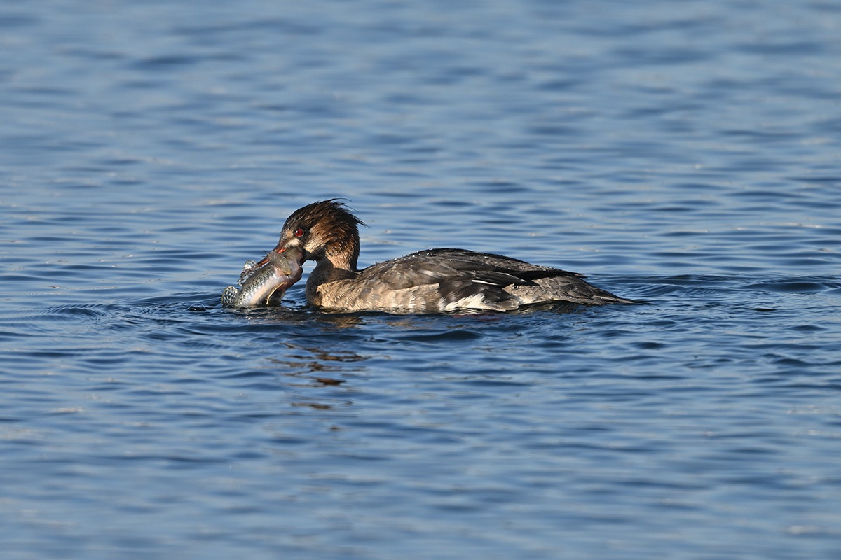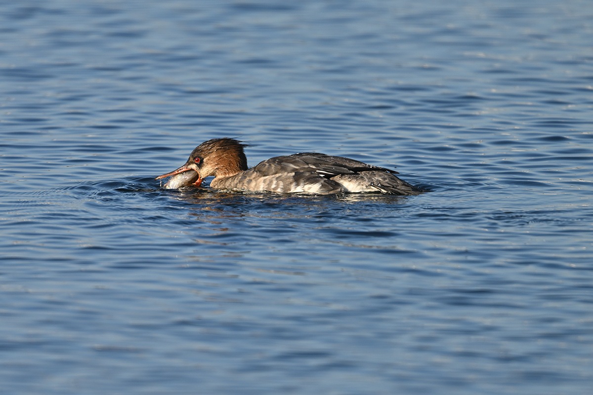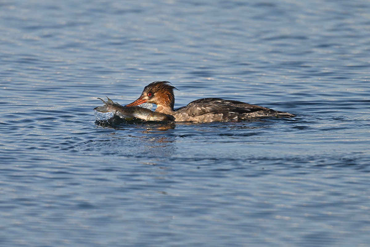 計算通りと言う事で撮影を進めてるとウミアイサが潜り見事なマハゼを捕まえ浮上して来ました。