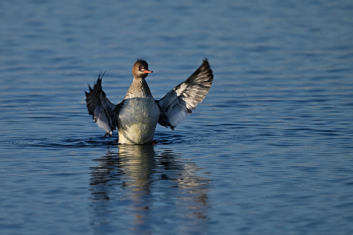 しかしながら釣り客が居たのできっと彼が帰ると来るとの読み通り、釣り人が帰ると岸壁目掛けて一羽のウミアイサがやって来ました。