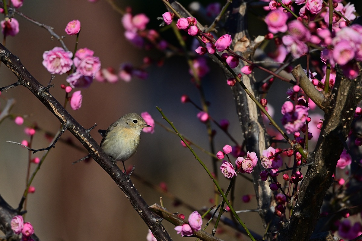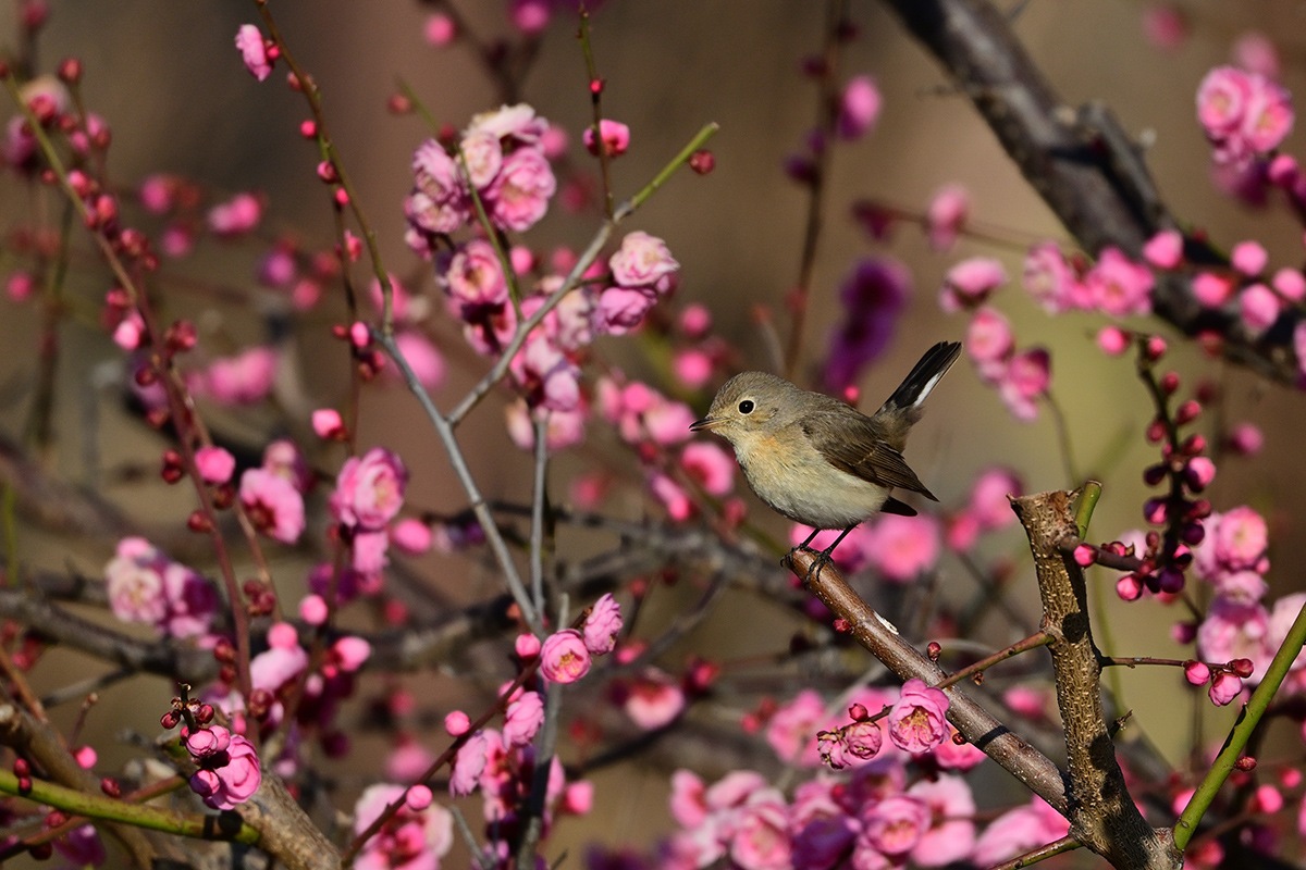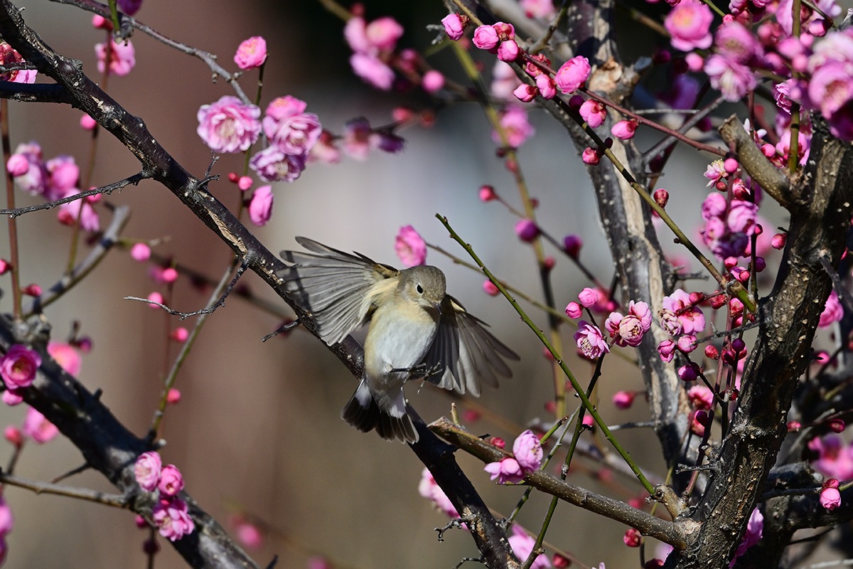 春の雰囲気が漂う小さな梅園にニシオジロビタキが時折姿を見せてくれます。