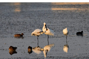 本日は朝陽が雲にさえぎられる事無くて奇麗に昇って来てましたので急いで準備してヘラサギの様子を見に出かけて来ました。朝日に輝くヘラサギ4羽、奇麗ですね。しかしながら相変わらず動きが無くて少し残念です。少しすると鴨達が何かに …